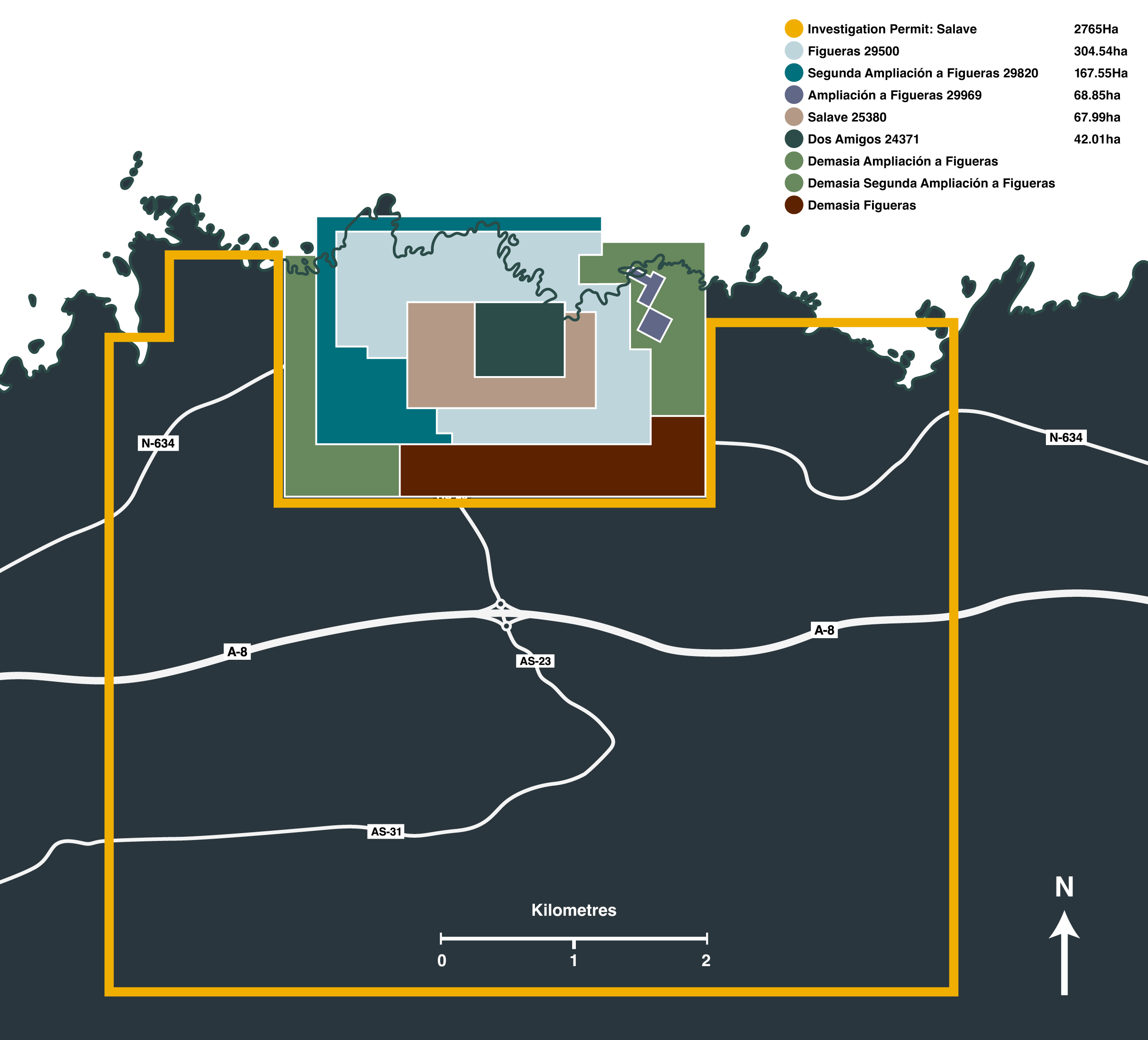EMC Gold owns 100% of the Salave gold deposit through its wholly owned Spanish subsidiary Exploraciones Mineras del Cantábrico. The EMC Gold tenure includes five Mining Concessions and associated extensions covering 662 ha and an Investigation Permit covering another 2,765 ha.